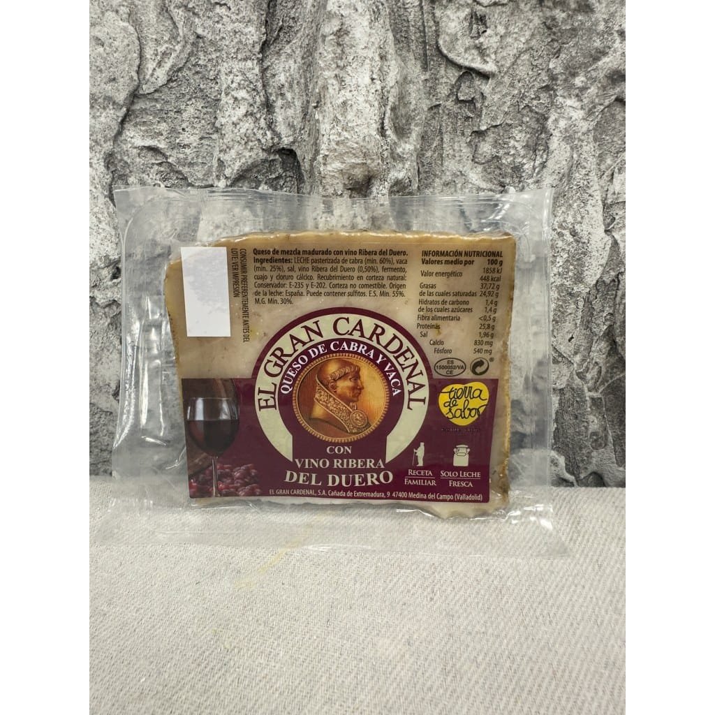 A refined mixed-milk cheese made with 60% goat and 25% cow milk, gently infused with 0.50% Ribera del Duero red wine. It offers a creamy texture, fruity aroma and distinctive ruby-toned rind. Matured with a natural rind. Perfect for wine pairings, cheese boards and gourmet experience.